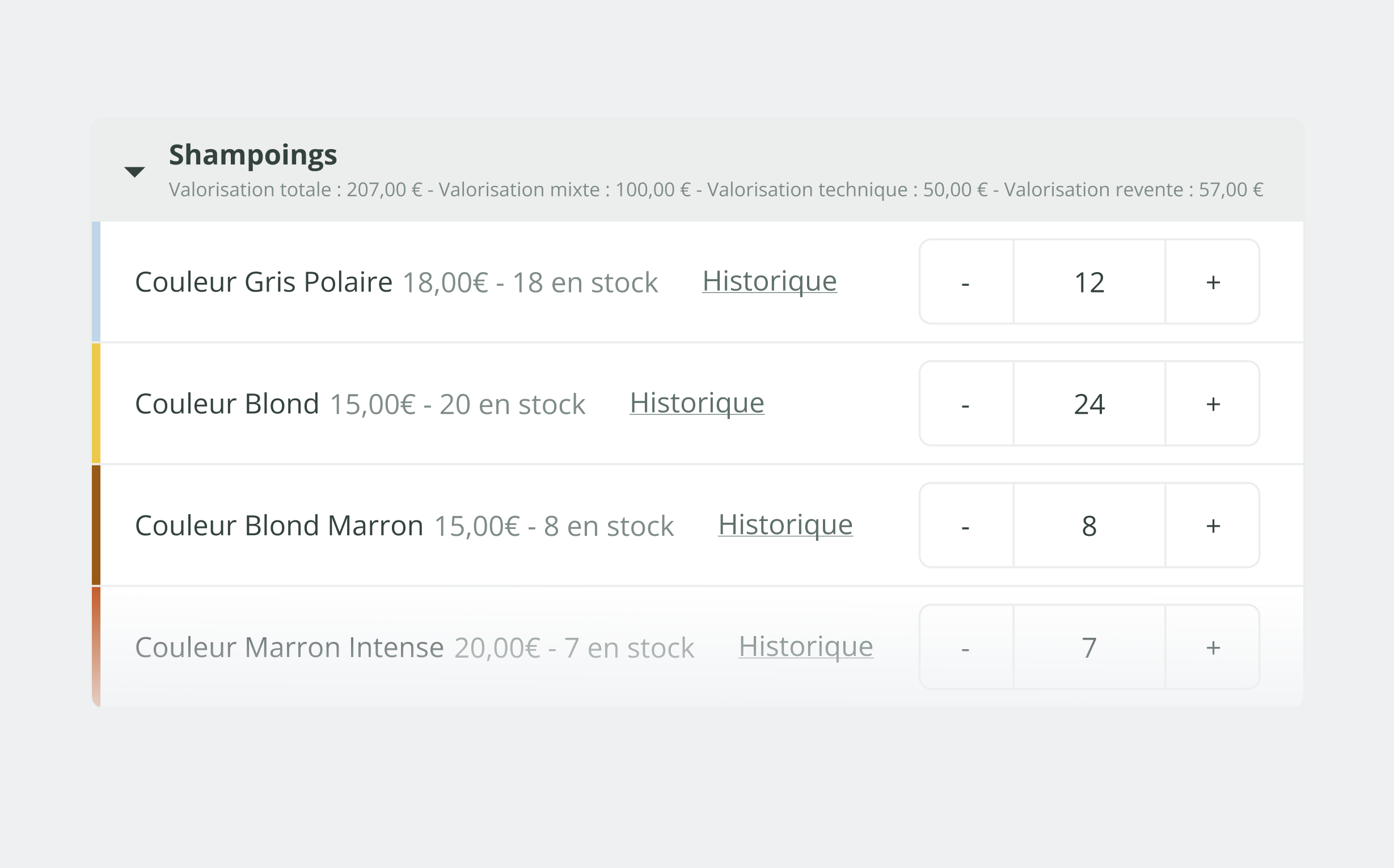 Vous avez la possibilité de réaliser des inventaires. La liste de vos produits s'affiche avec leur stock actuel, et vous pouvez entrer les quantités réelles en fonction de votre inventaire. Ainsi, vos stocks seront mis à jour selon les quantités enregistrées.